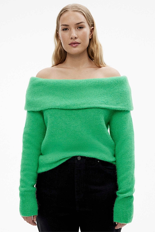 Alpaca Blend Off Shoulder Knit - Leaf Green